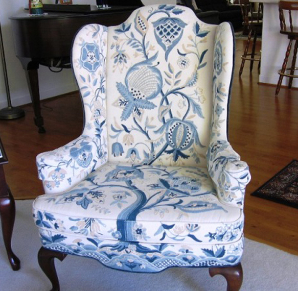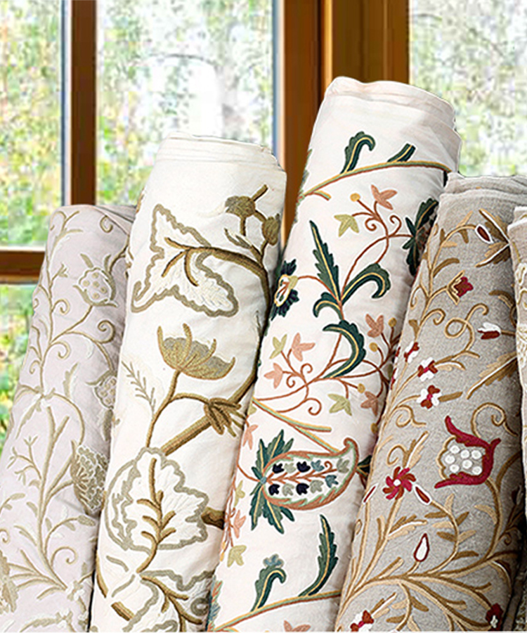 Elegant hand-embroidered crewel fabric, soft floral upholstery fabric, and vintage upholstery fabric- all varieties for precise levels of style for any interior design. Whether you employ the services of an upholsterer or go DIY, many designers and homeowners trust our materials.