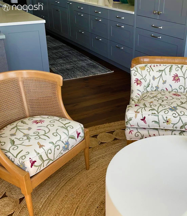 Our hand-embroidered crewel fabric, floral upholstery fabric, and vintage upholstery fabrics are suited for modern and classic interiors. Each yard of our fabric is an exclamation of culture, made with love and kindness, using time-tested methods of work, now carried by only a few Kashmiri artisans through generations.