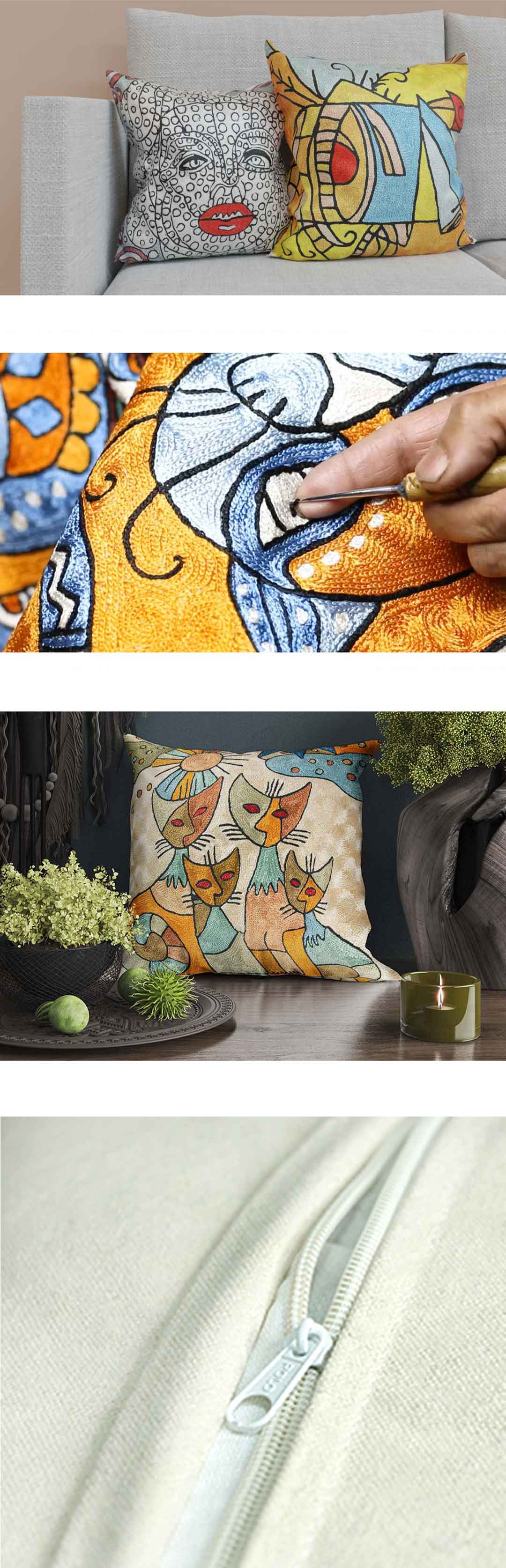 Picasso cushion covers, cat cushion covers, Kendasky cushion covers, and abstract cushion covers, all belong to a variety of our cushion covers aimed at making every space beautiful. Each unique decorative pillow covers has been accurately created by handmade craftsmanship so that Kashmir craftsmanship has been blended in with contemporary design in perfect harmony.